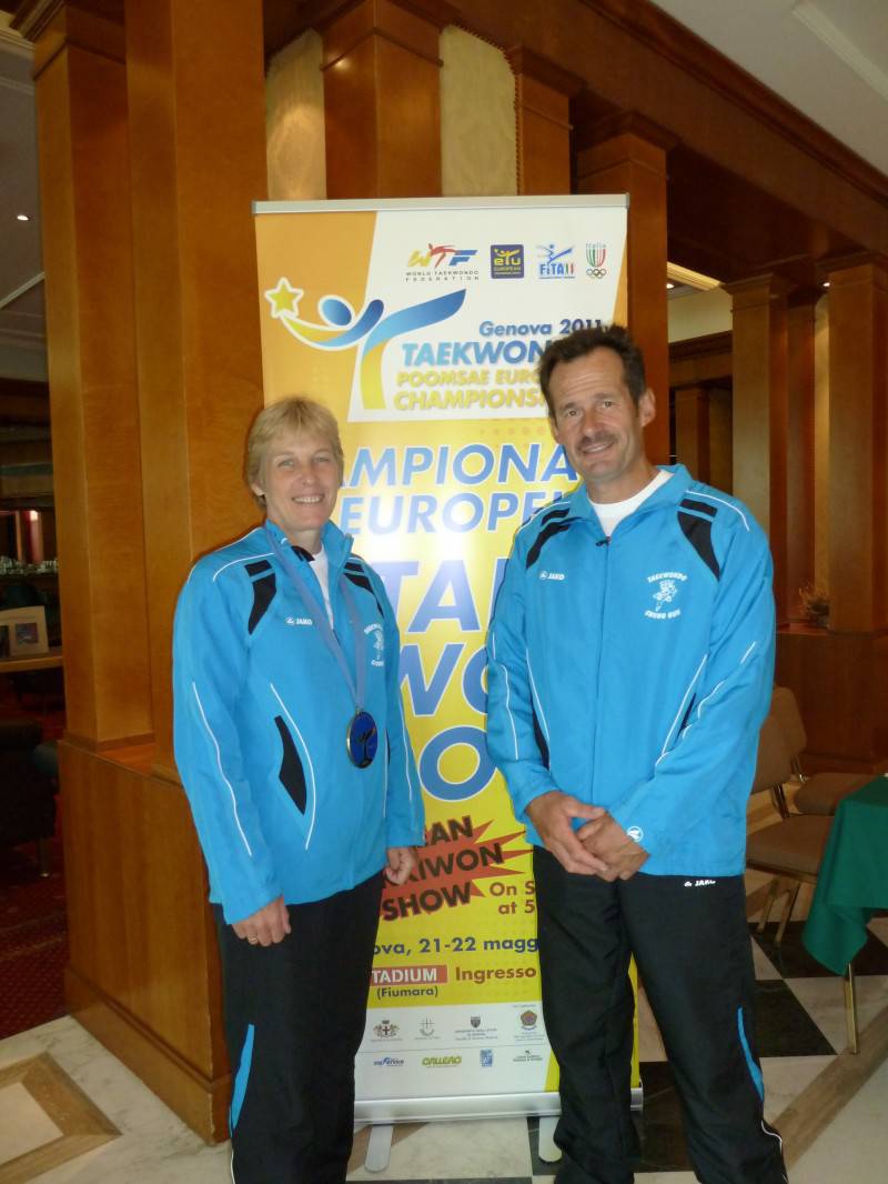 Woensdag 18 mei, toch best zenuwachtig. Mijn laatste EK en een groot doel voor ogen. 2 jaar hard gewerkt aan de voorbereiding voor deze wedstrijd. Nu moet het gaan gebeuren. De vlucht via München verliep vlot en met een prachtige blauwe hemel arriveerden we te Genova. Het hotel lag slechts een 200 meter van de luchthaven. Jan Meybosch en Sarang arriveren een dagje later. Heel veel teams verblijven ook in de Sheraton. Zij maken er echt een machtsspelletje van tijdens de oefentrainingen. Luide kreten galmen in het hotel. Iedereen is opperst nerveus voor de loting. Wie moet er starten? Vera Moens moet de eerste dag op de mat. Een goede loting in de 6e startpositie na Turkije (Europees kampioen in 2007) en Spanje (Wereldkampioen in 2009) en haar favoriete poomsae. Sarang Meybosch, die voor de eerste keer deelnam aan het EK moest zondag de mat op.
